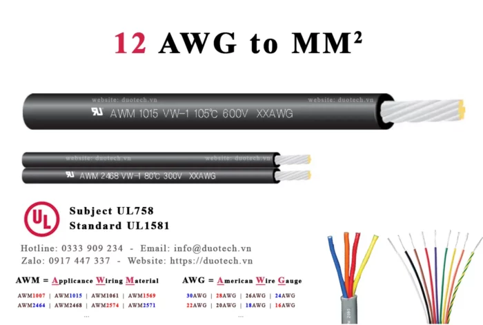 Bạn đang cần thông tin Bảng quy đổi – chuyển đổi 12 AWG to mm2, Lưu ý: Tùy vào đơn vị sản xuất dây cáp điện tiêu chuẩn UL mà bảng chuyển đổi / quy đổi cỡ dây 12AWG sang đơn vị tiết diện MM2 có thể chênh lệch trong khoảng cho phép của bộ tiêu chuẩn UL758.
