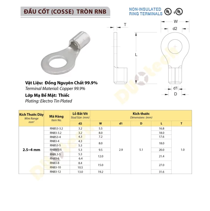 Các mã hàng phổ biến:. Đầu cos cốt cosse đồng tròn trần 4mm RNB