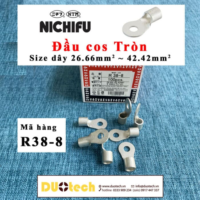 Bài viết chia sẻ Catalogue thông số bảng giá đầu cos tròn (cốt, cose, cosse khuyên vòng tròn) R38 Nichifu R38-6 R38-6S R38-8 R38-8S R38-10 R38-10S R38-12 Nhật Bản – Đầu cos đồng mạ thiếc chất lượng dùng bấm nối dây điện tiết diện 26.66~42.42 mm2