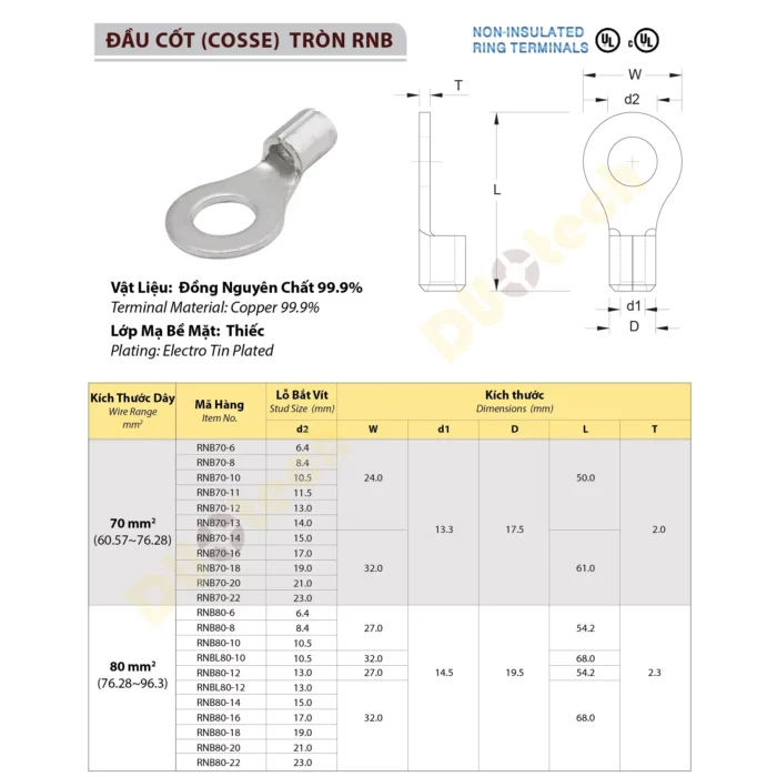 Các mã hàng phổ biến:. Đầu cos cốt cosse đồng tròn trần 70mm RNB