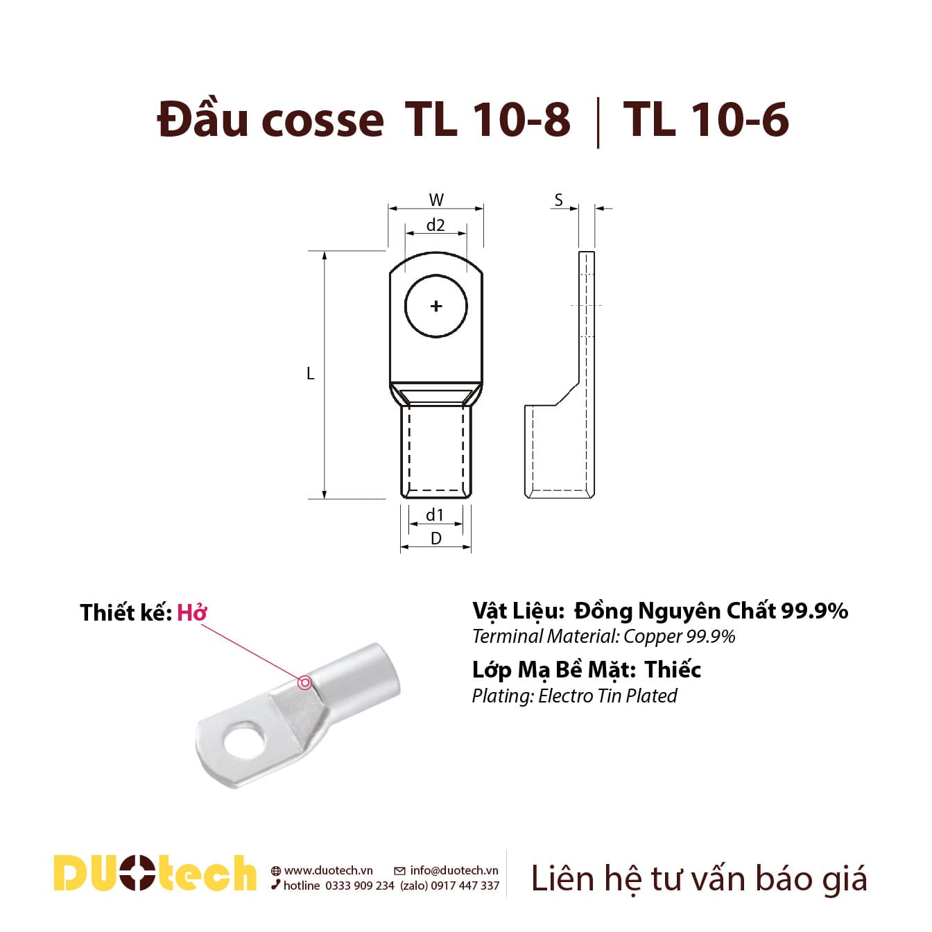Đầu cosse TL 10-5 10-6 10-8 cos cốt vật liệu Đồng, mạ Thiếc trắng, dùng bấm nối dây cáp điện tiết diện 10mm2
