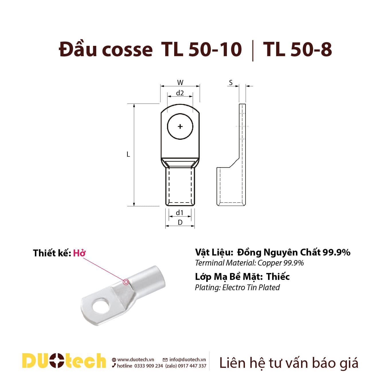 Đầu cosse TL 50-6 50-8 50-10 50-12 cos cốt vật liệu Đồng, mạ Thiếc trắng, dùng bấm nối dây cáp điện tiết diện 50mm2