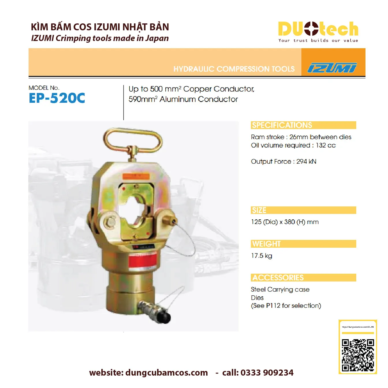 Đầu ép cos cốt cosse thủy lực Izumi EP-520C – NICHIFU NP 520 – Izumi hydraulic compression tools EP-520C, là dụng cụ ép cốt thủy lực dời bơm có: