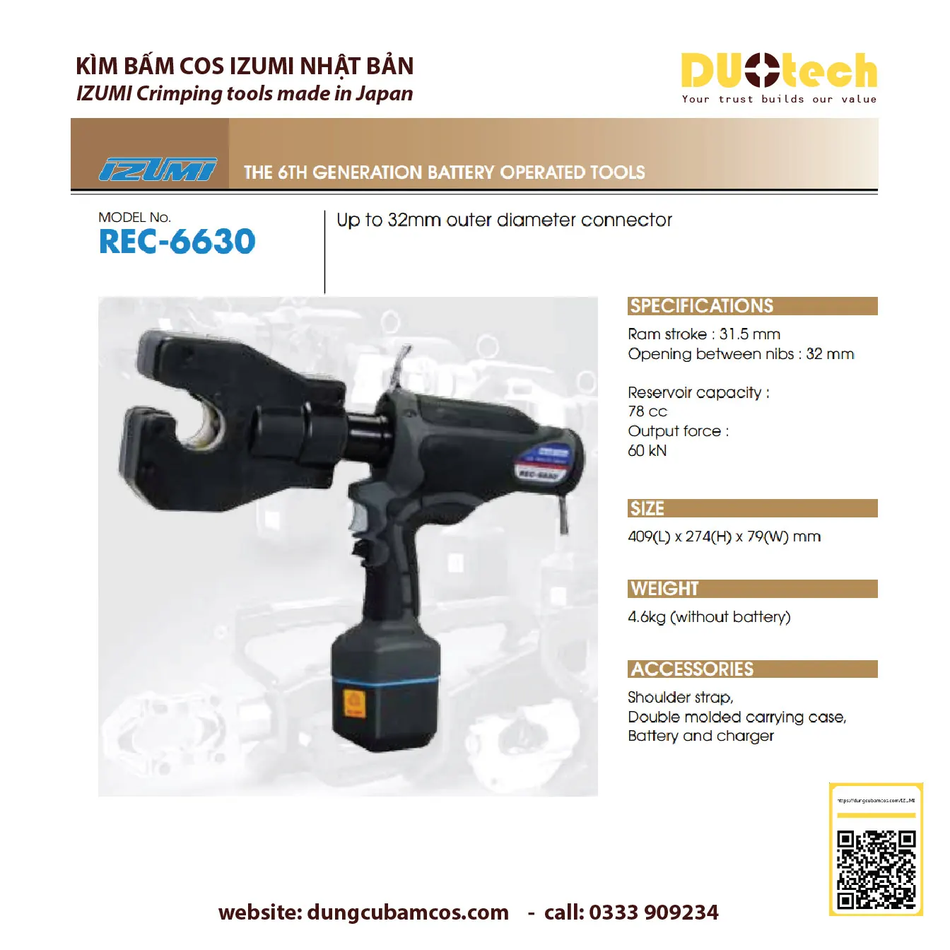 Máy ép kìm bấm đầu cos cốt cosse thủy lực dùng pin Izumi REC-6630 Izumi generation battery operated tools REC-6630: