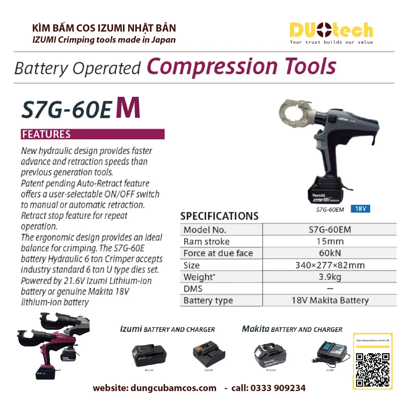Máy ép kìm bấm đầu cos cốt cosse thủy lực dùng pin Izumi S7G-60EM