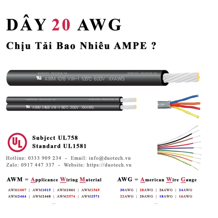 –>> thông số dây cáp điện 20awg tiêu chuẩn ul awm chịu tải bao nhiêu ampe