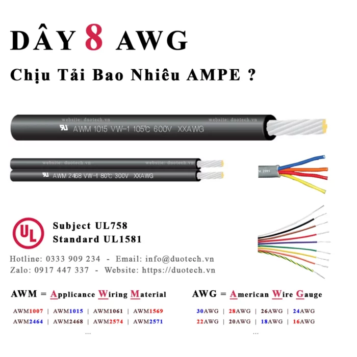 Thông số Dây cáp điện 8 AWG chịu tải bao nhiêu tiêu chuẩn Mỹ 8awg AWM UL cUL chống cháy VW-1 FT1
